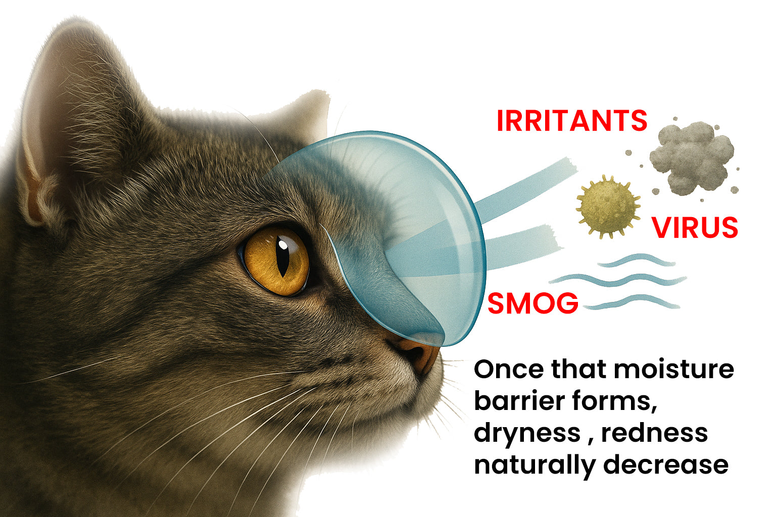 This means you don't have to worry about environmental irritants like pollen, smog, or AC drafts bothering their eyes. Once that moisture barrier forms, dryness and redness naturally decrease.